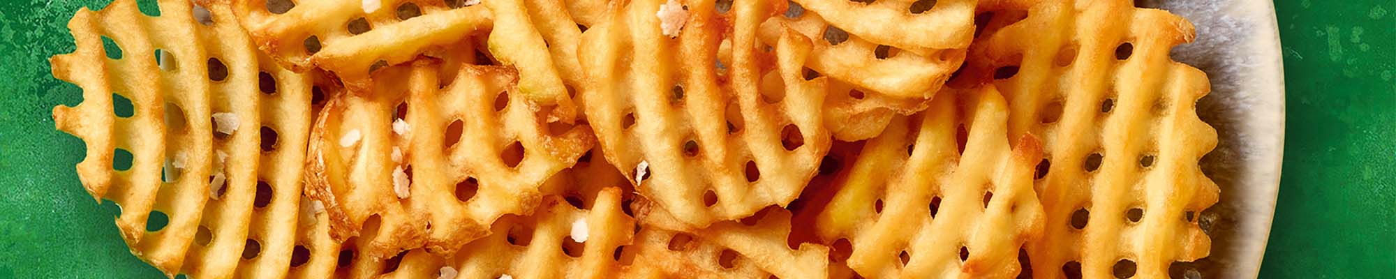 Backrohr auf 220°C Ober-Unterhitze vorheizen. Den halben Beutelinhalt (ca. 300g) der tiefgekühlten Gitterpommes einlagig auf einem mit Backpapier belegten Backblech verteilen und auf mittlerer Schiene ca. 19 Minuten goldgelb backen. Nach der Hälfte der Backzeit einmal wenden.