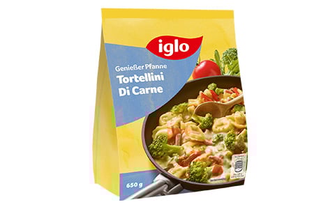 Ein Fest für Feinschmecker ist auch unsere Genießer-Pfanne Tortellini Di Carne. Mit iglo kommt das beliebte italienische Nudelgericht mit g’schmackigen Tortellini, Gemüse und Schinken in feiner Kräutersauce im Nu genussfertig auf den Teller. Wie der Name bereits verrät, ist es vor allem auch die Rindfleischfüllung, die diesem Pfannenklassiker sein wunderbar kräftiges Aroma gibt.