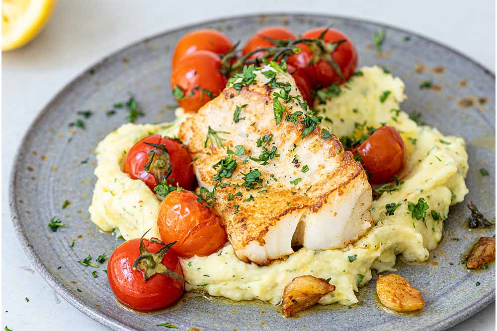 - Kabeljau Filets mit den geschmorten Tomaten und dem Kräuter-Kartoffel-Püree servieren. Mit dem Saft, der bei den geschmorten Tomaten entsteht, beträufeln und mit frischen Kräutern garnieren.