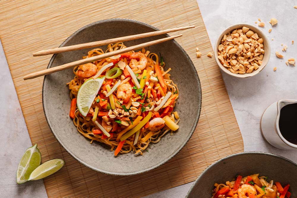 - Das Pad Thai auf Tellern anrichten und mit Koriander, Erdnüssen und Limette garnieren.