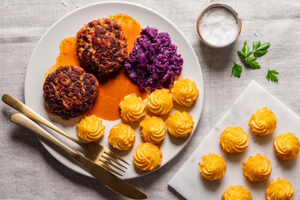 - Am Ende die faschierten Laibchen zusammen mit den Pommes Duchesse, dem Rotkraut und der Sauce auf Tellern anrichten.