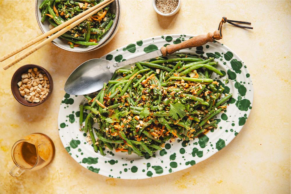- Die abgekühlten Fisolen, Karottenstreifen und Frühlingszwiebel in einer großen Schüssel mit dem Dressing vermengen.