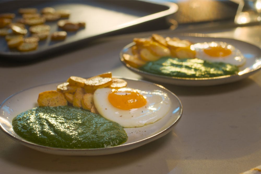 - Kartoffeln, Spinat und Eier auf vorgewärmten Tellern anrichten und mit Pfeffer servieren.