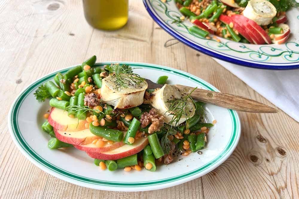 - Gekochte Linsen, Fisolen und Apfelstücke mit etwas Olivenöl, Apfelessig und Salz marinieren, auf Tellern anrichten und mit dem Ziegencamembert und den Nüssen garnieren.