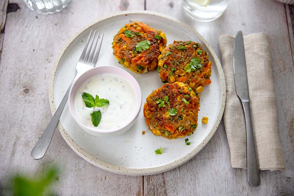 - Für den Dip, Minze fein hacken und mit Joghurt, Zitronensaft, Salz & Pfeffer vermengen und zu den Laibchen servieren.