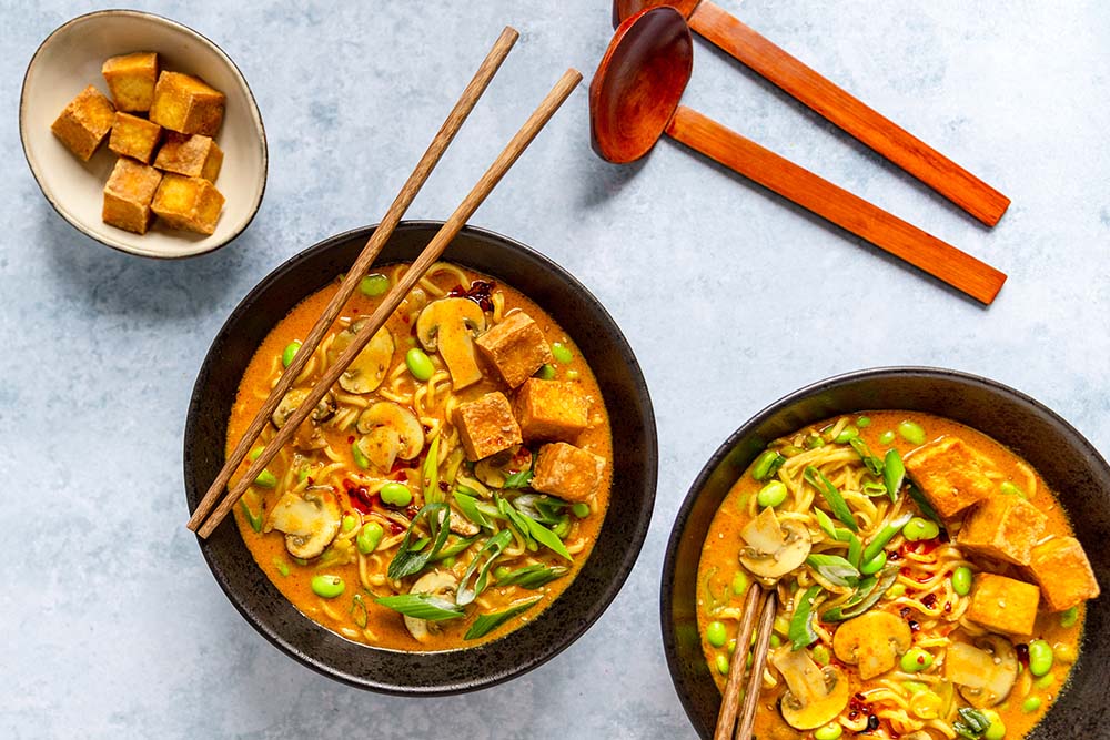 - Gut umrühren, auf Schüsseln verteilen und mit dem Tofu, grünen Frühlingszwiebeln, Sesam und etwas Chili toppen.