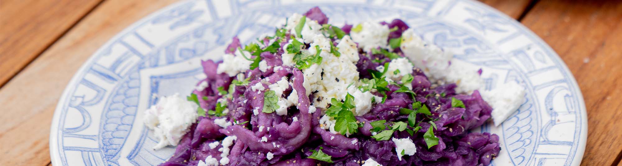 - Den zerbröckelten Feta-Käse und die gehackte Petersilie über die Spätzle und das Rotkraut streuen.