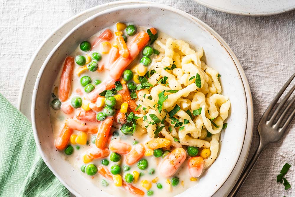 - Das Cremegemüse mit den Spätzle auf Tellern anrichten und mit Petersilie bestreuen.