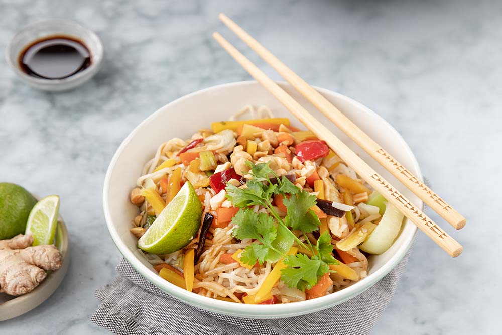 - Eiernudeln zum Gemüse in den Wok geben und alles vermengen. Wokgemüse und Nudeln in Schalen aufteilen und mit gehackten Erdnüssen, frischem Koriander und frisch gepresstem Limettensaft servieren.