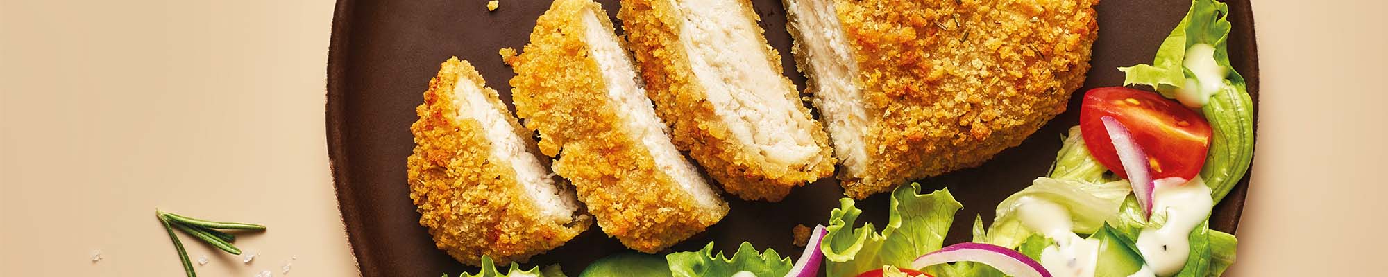 Wir verwenden zu 100% Fleisch, das aus der Hühnerbrust stammt. Dies macht am Gesamtprodukt 55% aus. Das Fleisch wird mit einer Flüssigwürze verfeinert und mit der iglo Panade (36%) umhüllt - fein gewürzt mit Rosmarin und Meersalz.