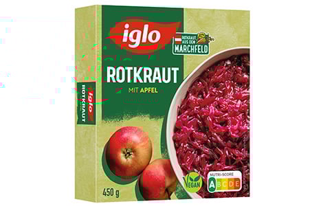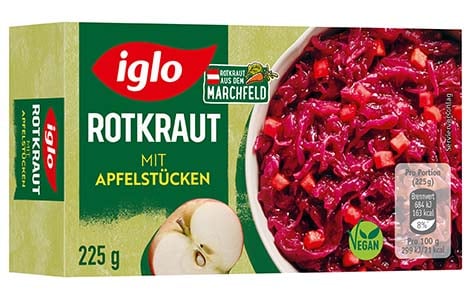 Das erntefrische, mit Apfel verfeinerte Rotkraut aus dem Marchfeld ist ein echter Genuss. Es eignet sich ideal als Gemüsebeilage für die Feiertage zu Wild und Geflügel. In verschiedenen Packungsgrößen erhältlich, bietet das iglo Rotkraut für Jeden was: das iglo Rotkraut 600g als köstliche Beilage für die ganze Familie, die 450g Packung ist passend für zwei und klassisch vegan und das kleinste Format mit 225g, vegan und mit Apfelwürfeln verfeinert, ermöglicht den Genuss auch ganz für Sie allein.