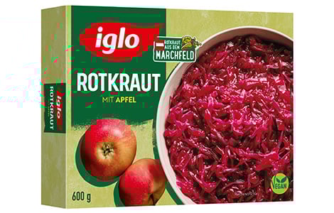 Als TK-Produkt ist das iglo Rotkraut das ganze Jahr über erhältlich, einfach und schnell zubereitet und kann als köstliche Komponente unzählige Gerichte aufwerten. Dabei eignet sich das ansehnliche Kraut keinesfalls nur als Beilage, sondern kann neben Geschmack auch als farbliche Komponente überzeugen, beispielsweise als Belag auf einer Pizza.