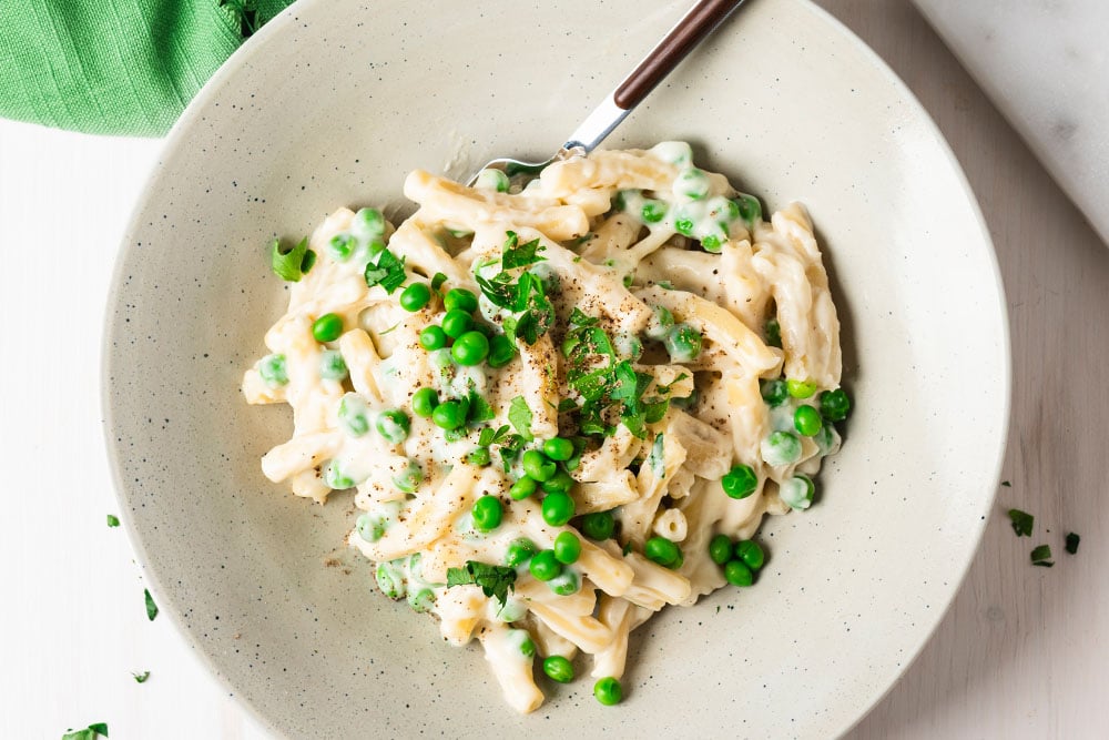 - Die Nudeln mit der Käsesauce mischen und die Erbsen vorsichtig unterheben.